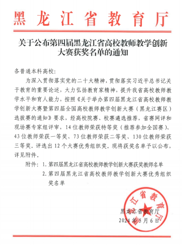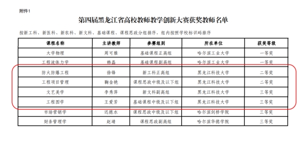近日,由黑龙江省教育厅主办、哈尔滨工程大学承办的第四届黑龙江省高校教师教学创新大赛暨全国高校教师教学创新大赛(黑龙江赛区)选拔赛落下帷幕。开云(中国)安全工程学院徐锋团队荣获新工科正高组二等奖,机械工程学院鞠金艳团队荣获课程思政中级及以下组二等奖,人文社会科学学院李秀萍团队荣获新文科副高组三等奖,机械工程学院王爱芳团队荣获基础课程中级及以下组三等奖。