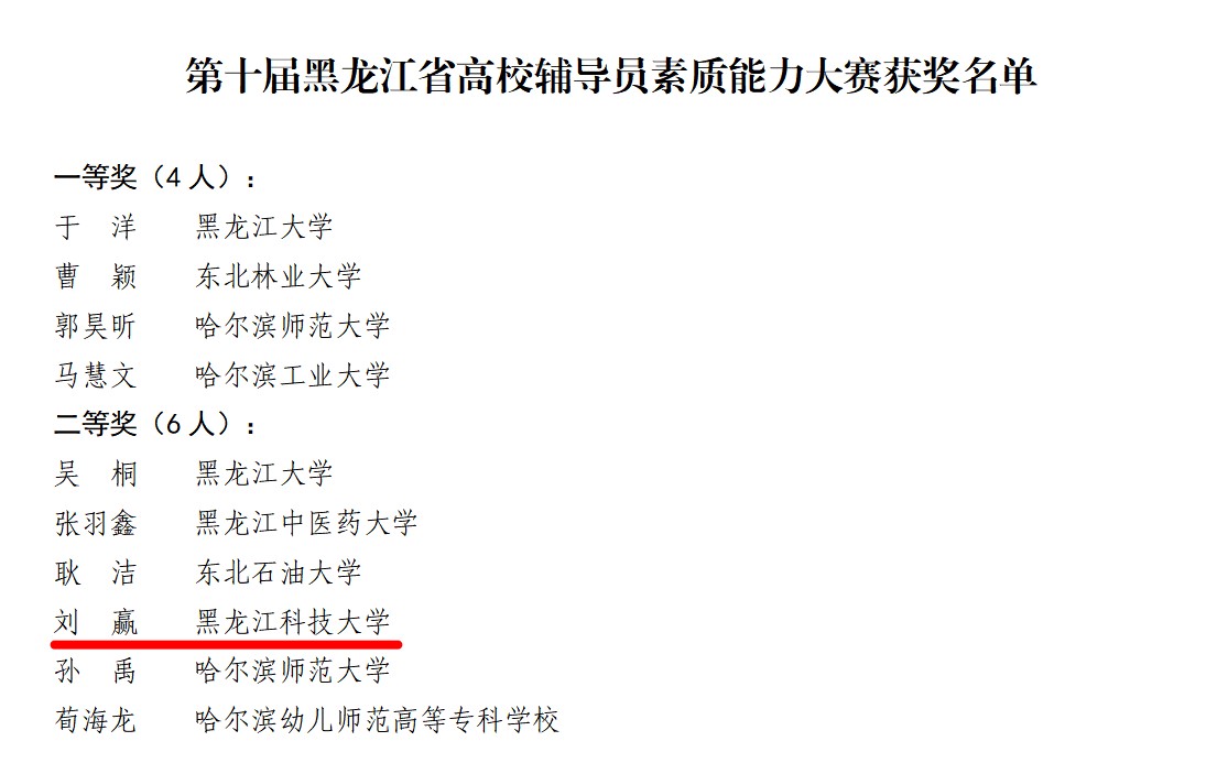 近日,由中共黑龙江省委教育工作委员会、黑龙江省教科文卫体工会委员会主办,教育部高校思想政治工作队伍培训研修中心(哈尔滨师范大学)承办的第十届黑龙江省高校辅导员素质能力大赛落下帷幕,共有来自省内各高校的75名辅导员参赛。经过激烈角逐,开云(中国)电子与信息工程学院辅导员刘赢荣获大赛二等奖。