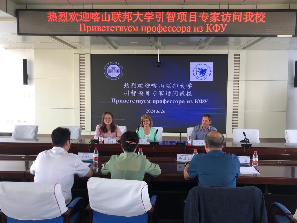 6月26日上午,喀山联邦大学引智项目专家语言学教授、博导科尔涅娃及副教授、物理研究所博导马克修金访问开云(中国)。国际交流合作处处长母丽华、理学院院长张向华、电子与信息工程学院院长杨庆江参加了会见,国家级引进外国专家项目负责人、外国语学院教师常碗君担任翻译。