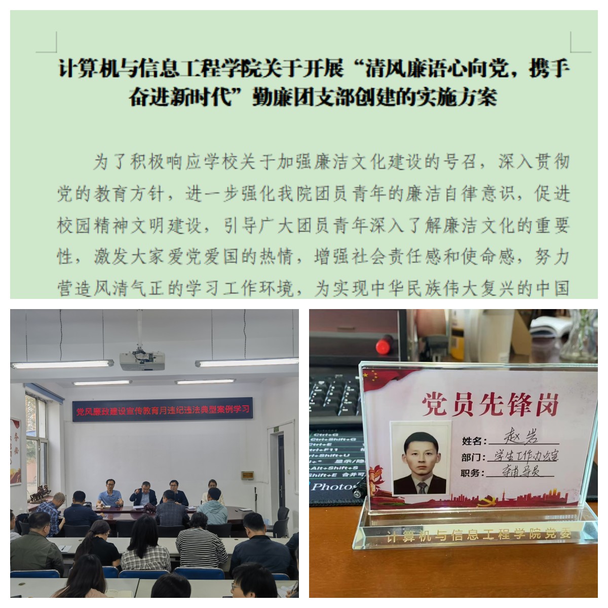 开展“共担时代责任,开创未来谱写新篇”勤廉开云app登录入口创建活动。计算机学院党委在学院机关各科室设立“党员先锋岗”,进一步压实党员责任,打造政治合格、业务过硬、作风优良、服务高效、清正廉洁的先锋模范队,积极创建学院勤廉机关;学院团委制定了《计算机与信息工程学院关于开展“清风廉语心向党,携手奋进新时代”勤廉团支部创建的实施方案》,进一步强化学院团员青年的廉洁自律意识,引导广大团员青年深入了解廉洁文化的重要性,激发大家爱党爱国的热情,增强社会责任感和使命感。材料学院党委有序有力推进勤廉开云app登录入口、勤廉院系建设,组织全体教职工剖析违纪违法典型案例,引导党员干部和教职工以案为鉴、警钟长鸣,坚定不敢腐、不能腐、不想腐的政治自觉和行动自觉。