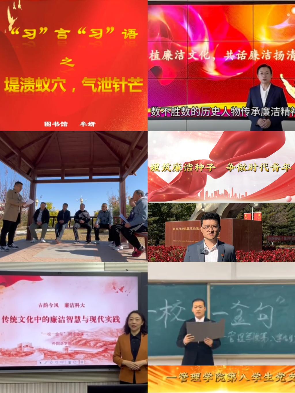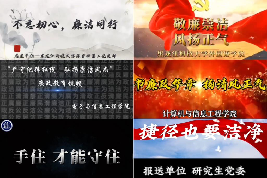 开展“严守纪律红线,弘扬廉洁风尚”党风廉政建设视频作品征集活动。各单位党组织紧扣时代主题、聚焦廉洁典型、放眼历史长河、挖掘文化基因,创作了《书廉政华章扬清风正气》《不忘初心廉洁同行》等具有政治性、思想性、艺术性的情景剧、微电影、短视频等作品,增强廉洁教育价值引导力、文化凝聚力、精神推动力,为落实立德树人根本任务培育壮大校园正能量。
