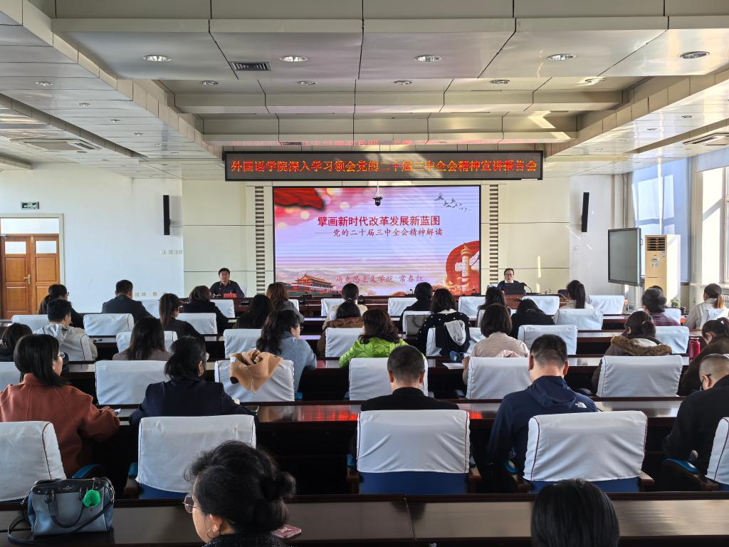 10月23日下午,外国语学院在办公楼6004会议室召开深入学习领会党的二十届三中全会精神宣讲会。学校宣讲团成员、马克思主义学院教师常春红作宣讲报告,学院全体教职工参加宣讲会。宣讲会由党委书记张海涛主持。常春红教授以《擘画新时代改革发展新蓝图》为题,生动讲述了党的二十届三中全会的召开背景及重大意义,全面讲解了党的二十届三中全会精神的丰富内涵和精神实质。
