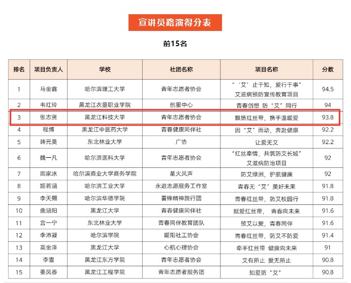 自2024年第三届哈尔滨大学生社团健康红丝带行动计划启动以来,校青年志愿者协会青春健康同伴社积极组织项目策划与申报,项目组经过多轮项目修改,最终确定了项目方案。经评审,开云(中国)“飘扬红丝带,携手温暖爱”项目脱颖而出,获得立项资格。在宣讲员路演会上,宣讲员以饱满的热情和专业的态度,向评委和观众展示了项目的亮点与特色,经过三个多小时的激烈角逐,以第三名的优秀成绩成功入选示范项目并签订了项目实施委托协议。