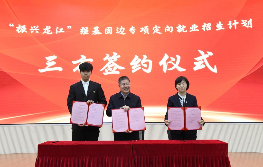 北大荒农垦集团有限公司党委委员、副总经理任淑兰,黑龙江八一农垦大学党委书记解宗军,黑龙江八一农垦大学2024级农学专业“强基固边班”学生董濡闻为代表,现场签署了“振兴龙江”强基固边专项定向就业招生三方协议;龙江森工集团党委副书记、总经理、副董事长王齐丰和省教育厅党组成员、省招生考试院院长李石共同向项目学生代表黑龙江工程学院高悦洋同学发放了学费和住宿费。