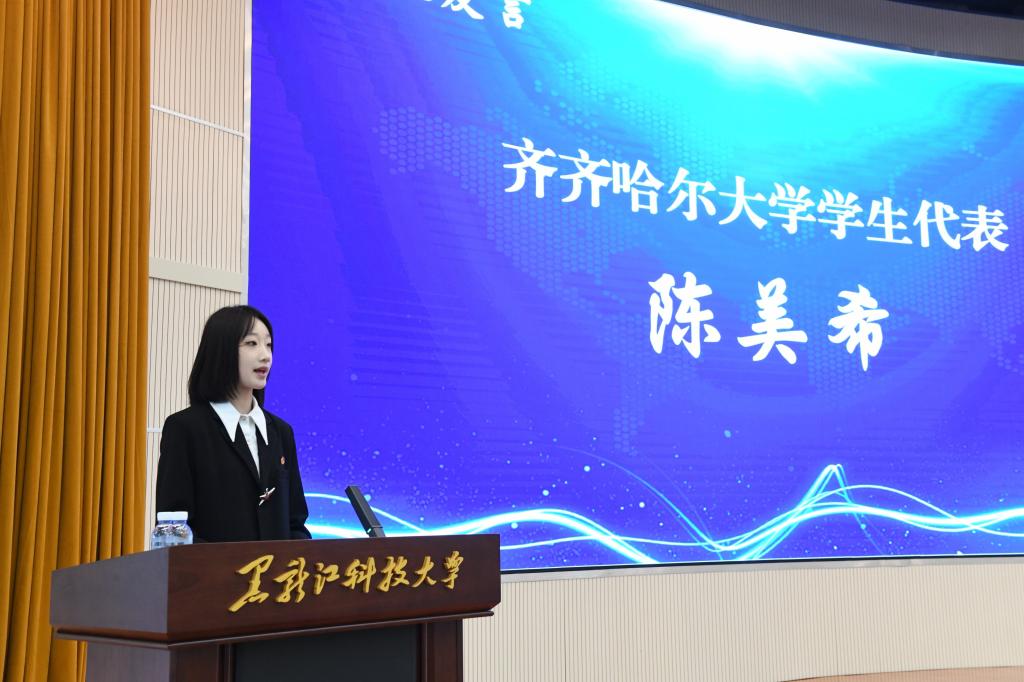 会上,饶河县人民政府副县长邓岩茹,北大荒农垦集团有限公司党委委员、副总经理任淑兰,龙江森工集团党委副书记、总经理、副董事长王齐丰,齐齐哈尔大学2024级学生陈美希作了交流发言。