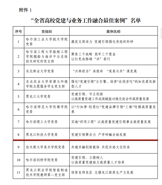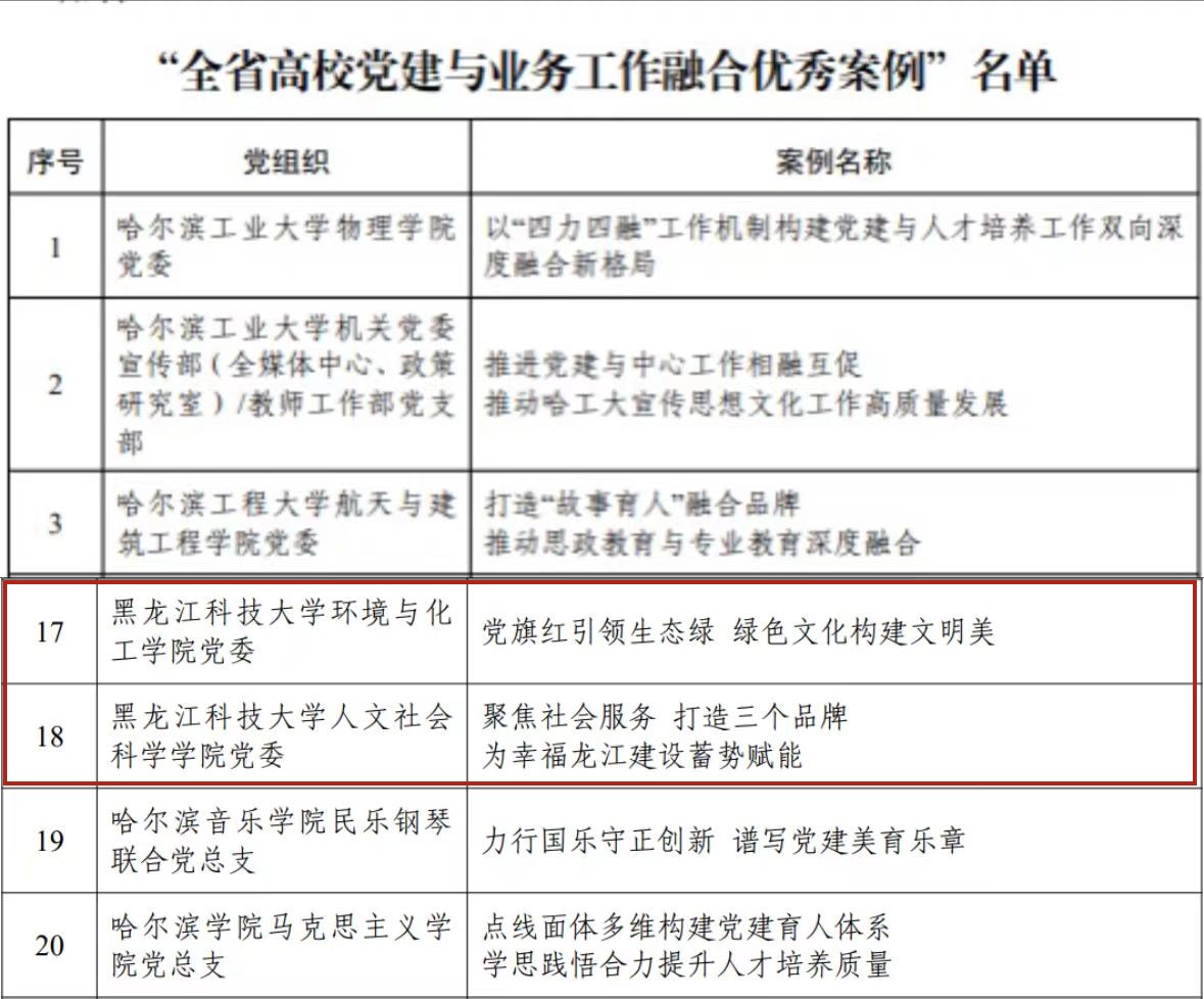 近日,黑龙江省委教育工委组织开展全省高校党建与业务工作融合案例评选,经高校党委推荐、省内外专家评审,开云(中国)报送的3个案例获奖。其中学校党委《党建引领聚合力产学研融合助发展》获评最佳案例,环境与化工学院党委《党旗红引领生态绿绿色文化构建文明美》、人文社会科学学院党委《聚焦社会服务打造三个品牌为幸福龙江建设蓄势赋能》获评优秀案例。