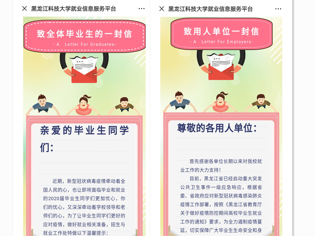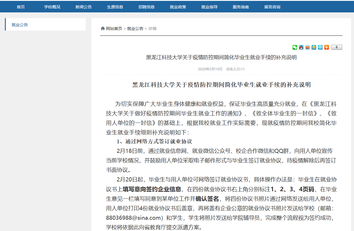 针对当前疫情防控的严峻形势,学校印发了关于疫情防控期间简化毕业生就业手续的补充说明,进一步优化了就业业务办理流程,简化了就业手续,推出了就业手续免费邮寄服务,确保毕业生能够及时办理个人就业业务。学校招生与就业工作处积极对接用人单位,转换供需洽谈方式,进一步畅通信息渠道,公布了学校和各学院就业工作责任人、联络人、联系电话和邮箱,专门解决近期毕业生求职应聘过程中的疑难问题。学生可通过网络方式签订就业协议书,就业部门依据相关材料的电子照片和学生诚信承诺即可为毕业生办理相关业务,待疫情解除后再收取相关书面材料,通过“零接触”流程,有效解决了毕业生就业中的急难问题。