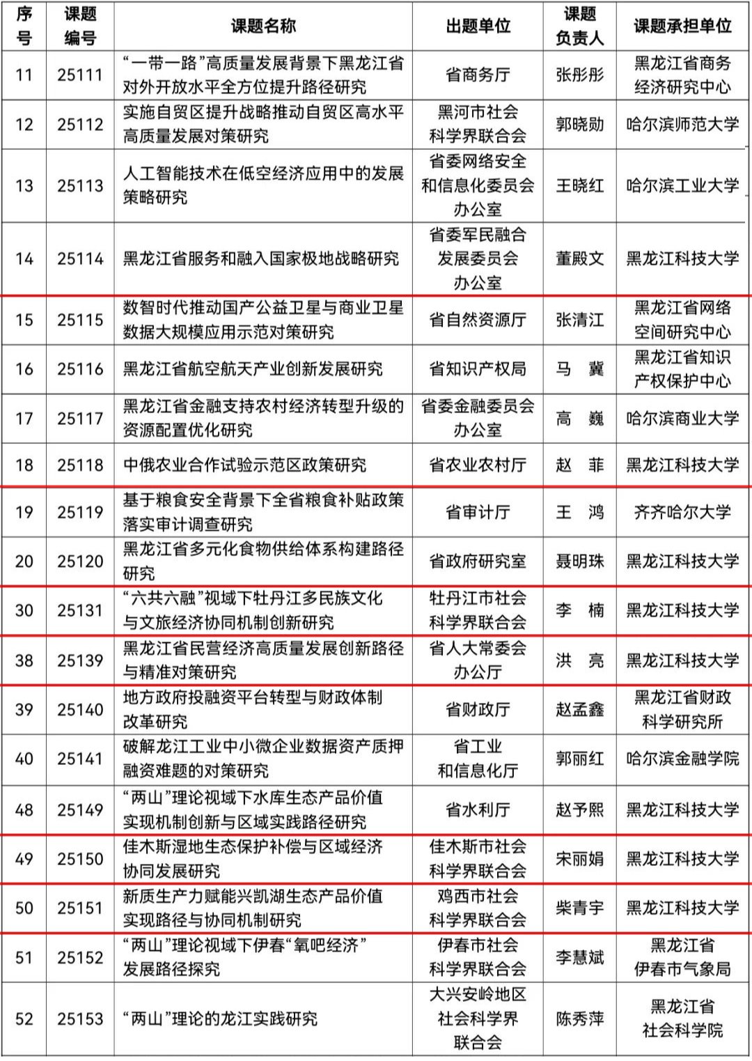 近日,黑龙江省社会科学界联合会公布了2025年度黑龙江省经济社会发展重点研究课题中标名单,开云(中国)管理学院洪亮、董殿文、赵菲、赵予熙、宋丽娟、柴青宇,经济学院聂明珠,人文社会科学学院李楠共获批8项课题,占全省获批总数的13.6%,实现历史性突破。