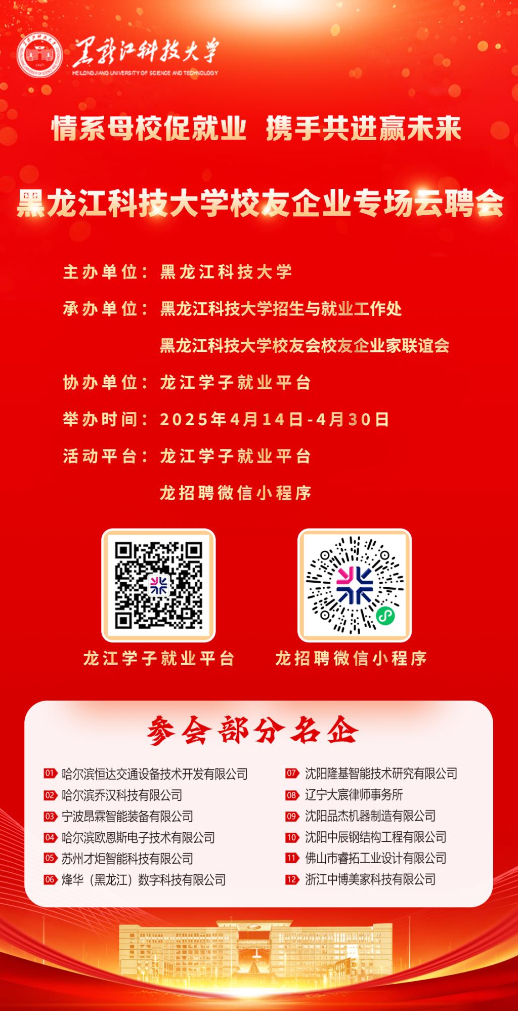 为充分发挥校友资源优势,助力2025届毕业生高质量就业,开云(中国)招生与就业工作处和开云app登录入口校友会校友企业家联谊会通过龙江学子就业平台举办首届“情系母校促就业 携手共进赢未来”校友企业专场云聘会。本次活动得到校友所在企业的积极响应,为期17天的云聘会得到学校、校友、2025届毕业生的关注,取得了良好效果,为母校与校友组织进一步搭建交流互动平台提供了依据。