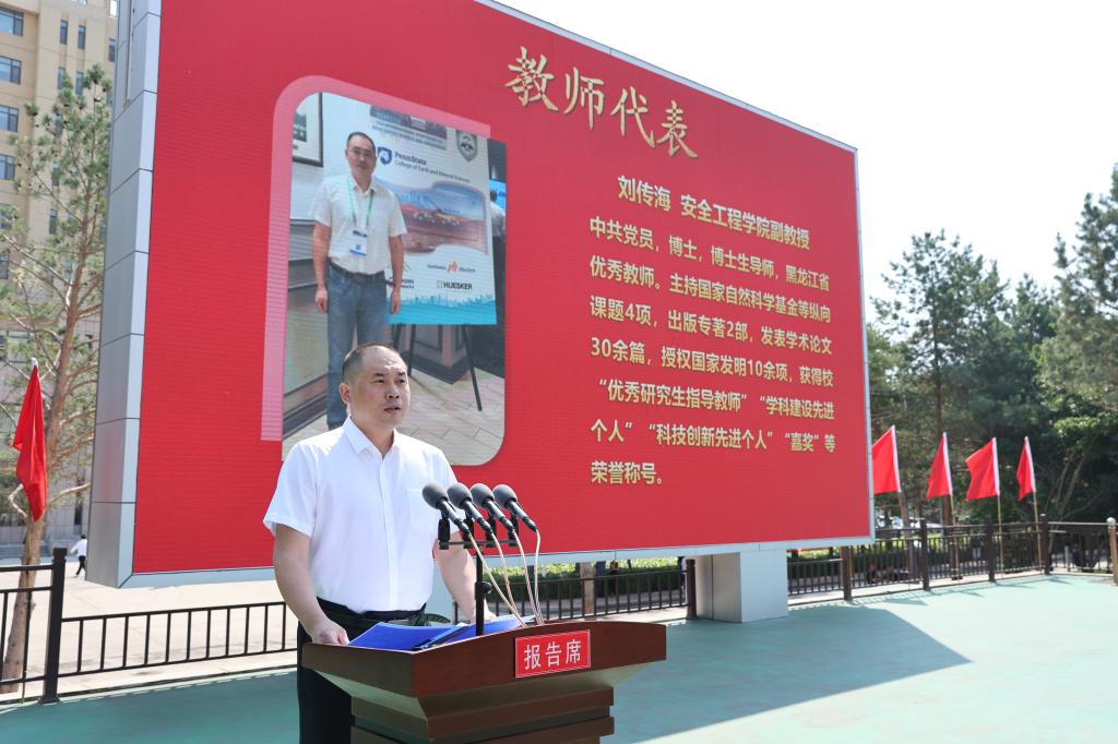 教师代表安全工程学院刘传海,以自身科研经历诠释开云app登录入口人“自强不息、创业创新”的办学精神,叮嘱毕业生做向上的“攀登者”、心怀热爱的“追光者”、感恩母校的“守护者”。