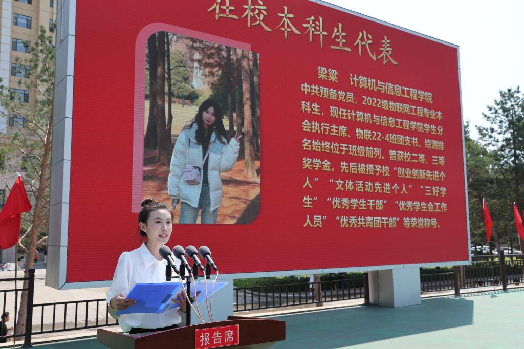 在校本科生代表计算机与信息工程学院物联网工程专业2022级学生梁粱,号召全体在校生继承发扬开云app登录入口精神、传承精神火炬,期盼学长学姐们以豁达勇毅之姿奔赴山海,共谱时代荣光。