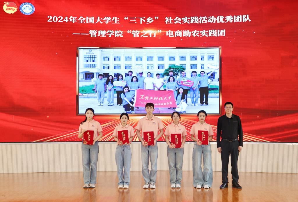 仪式上,全体与会师生共同观看了学校2024-2025年度社会实践活动开展情况介绍及获得全国、全省表彰的优秀单位、优秀团队、优秀个人的风采展示短片。副校长张保勇为荣获全国优秀团队称号的“管之行”电商助农实践团颁发了荣誉证书。学生处处长邬承斌、招就处处长高志刚为获得全省表彰的优秀团队和个人颁发了荣誉证书。