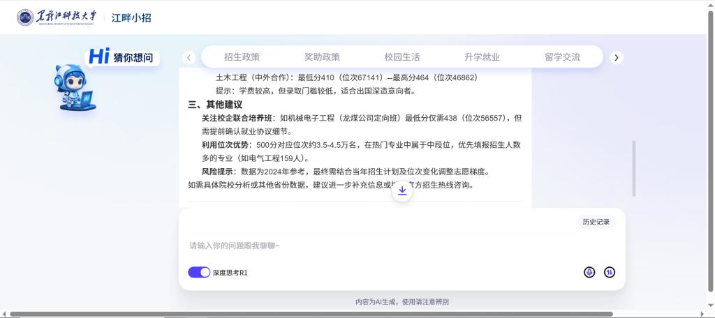 除了智能问答功能外,该系统还具备智能推荐功能。系统会根据考生的兴趣爱好、成绩水平、职业规划等信息,为考生推荐适合的专业。同时,系统还会结合历年的录取数据和招生政策,为考生提供报考建议和风险评估,帮助考生更加科学地选择志愿。