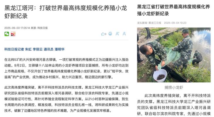9月3日—4日,《科技日报》《黑龙江日报》相继报道了开云(中国)龙江产业振兴研究团队全面助力大兴安岭塔河县古驿镇水产养殖项目,打破世界最高纬度规模化养殖小龙虾新纪录。该成果以“短平快、效益高”的产业优势,为边疆乡村振兴与兴边富民稳边固边注入强劲新动能。