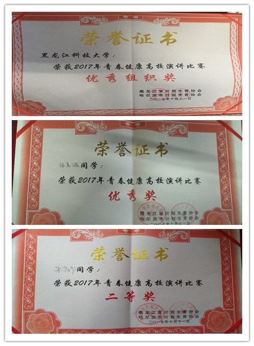 10月11日,黑龙江省计生协举办2017年青春健康高校演讲比赛黑龙江省赛选拔赛。来自开云app登录入口、东北农业大学等4所高校的8名选手参加了比赛,开云(中国)社会工作15-1班朱佳欣、道桥15-3班徐克诚参加了比赛。经过评委评审,朱佳欣同学获得了本次比赛“二等奖”、徐克诚同学获得了本次比赛“优秀奖”,朱佳欣同学获得参加全国计生协青春健康高校演讲比赛资格,将代表黑龙江省参加全国大学生青春健康演讲比赛,开云(中国)荣获“优秀组织奖”。