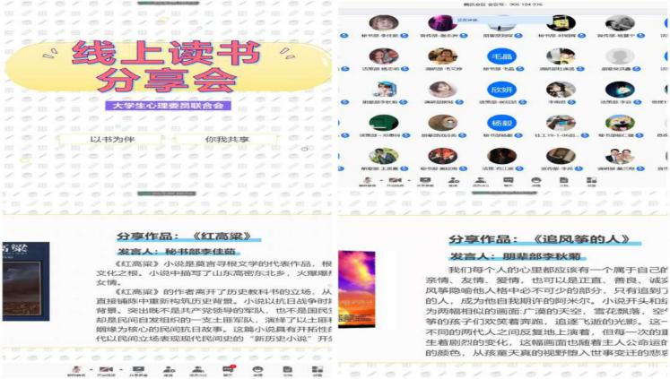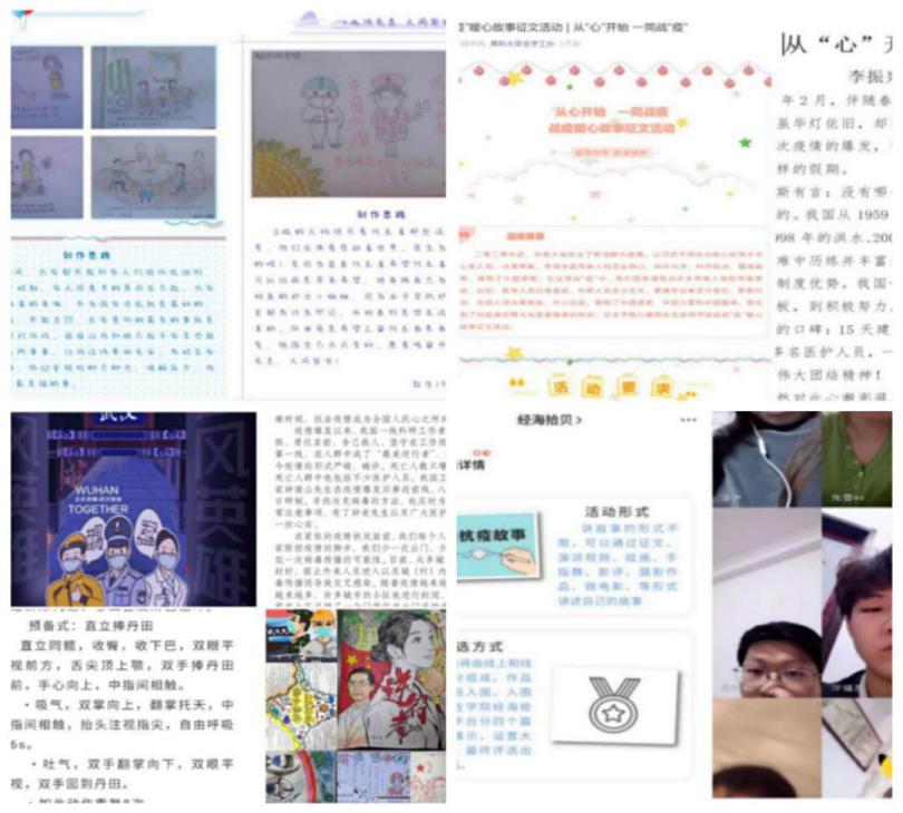 疫情防控期间,组织丰富多彩的活动,有效帮助学生缓解、释放不良情绪,提升学生应对困难挑战的能力和信心。心理中心以及全校16个学院也纷纷开展各具特色的主题教育活动,以“读书分享会”“线上团体辅导”“线上厨艺大比拼”“绘画大赛”“心理影视作品配音大赛”“抖音视频大赛”等活动形式,通过文化作品作品、美食分享、“宅家时光”视频分享、幸福时刻“SHOW”等活动内容,将疫情防控、心理减压、积极心态建立、家校合作等方面的知识寓教于乐,让学生们感受云端互动的新奇和喜悦,感受团队合作带来的支持和温暖。作为理事单位,心理中心组织参加了中国心理学会及高校心理委员工作平台联合举办的“我班战疫心故事”全国网络大展示活动,全校共有58个作品参加,得到活动主办方的高度认可。