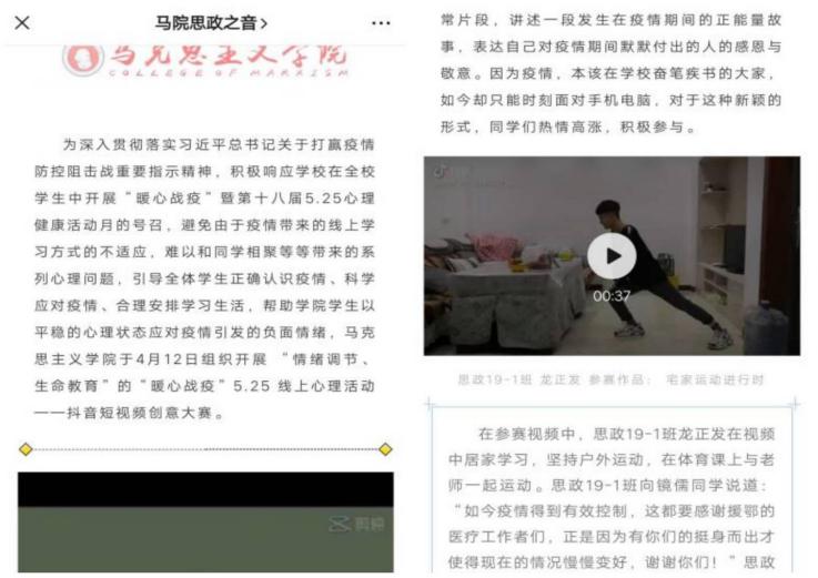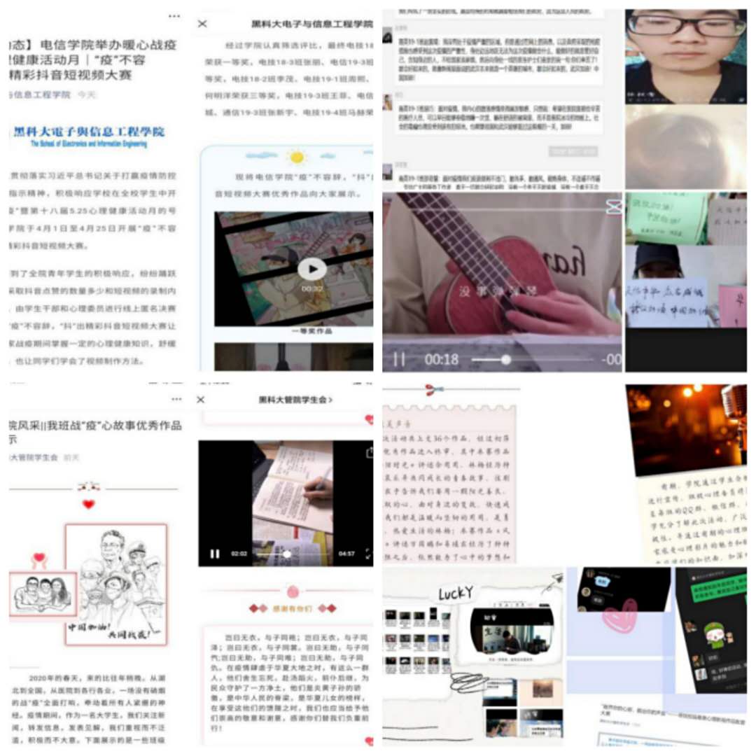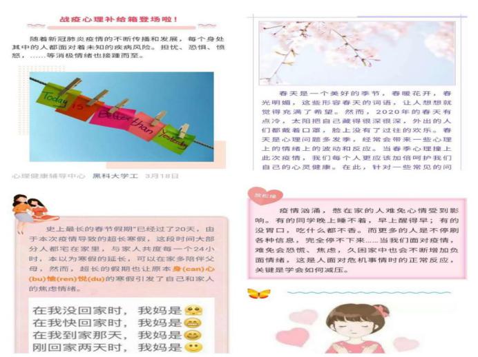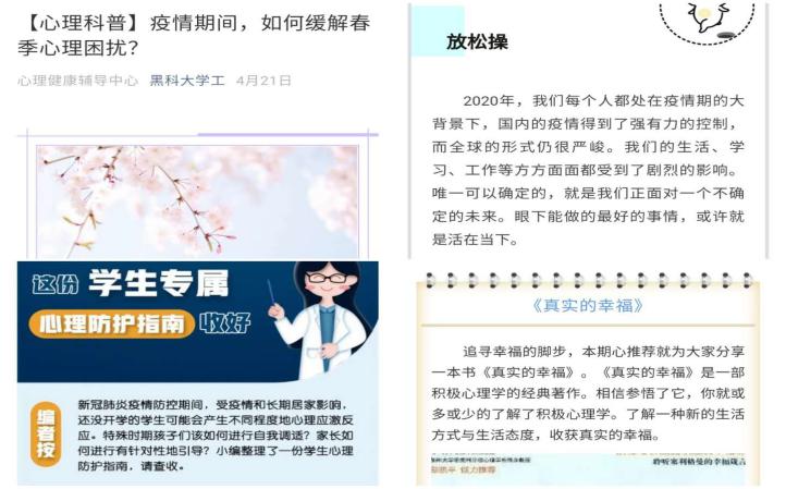 结合学生居家生活状态,心理中心和各学院充分利用网站、官方微信“黑开云app登录入口学工”、各学院公众平台等新媒体端,为广大师生提供疫情期间的心理科普知识、心理问题应对、身心放松操、心理图书分享、心理影片分享等维持正常生活、学会自我心理调节、寻求社会支持和心理干预等方面的技巧和方法,促进了学生稳定良好心态的保持。