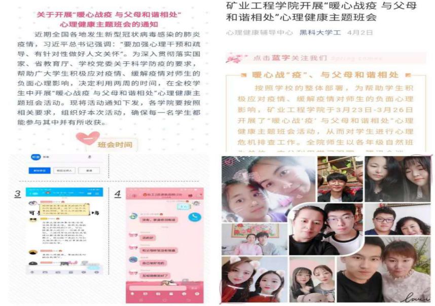 为了更好的使思政教育与心理健康教育有效结合,心理中心统筹各学院创新工作方式,“屏对屏、面对面、心连心”确保思政教育和心理教育不掉线,心理中心面向全校学生组织开展了“暖心战疫 与父母和谐相处”心理健康主题班会活动。引导学生正确面对春季可能出现的心理问题,正确判断自己的心理状况,正确处理与父母之间的冲突,以及正确进行心理疏导和求助等。通过在线“云班会”,既帮助学生科学面对心理变化,丰富了心理预防知识,又达到了云端思政的预期效果,营造了积极氛围,促进了家校协同育人和良好互动。
