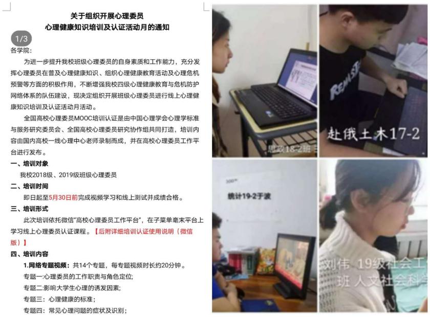为了更好的提高心理健康工作队伍能力和水平,心理中心分别组织全体学生工作干部、大学生骨干、心理委员、班主任等参加了教育部、省教育厅、中国心理学会等组织开展的有关高校心理危机干预、复课前后高校学生心理健康工作、心理援助热线等方面的培训及讲座,学习内容涉及心理问题的特征及辨识、心理辅导的方法与技巧、不良情绪的疏导与调整等,通过培训,不仅强化了学校“四级”心理健康队伍的工作意识和全员意识,也提高了心理危机事件处理能力,利于未来工作中更好引导大学生理性认识和应对疫情带来的学习、生活和就业的影响,更好的帮助学生学会接纳、积极生活、快乐成长。