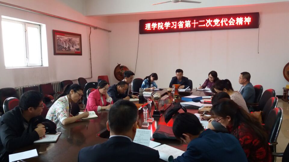 理学院党委于5月3日召开了院党委委员、各党支部书记,系部中心主任、副主任,综合办、学工办人员参加的理论学习中心组学习扩大会议;并于5月17日下午召开全体教职工会议,传达学习省第十二次党代会精神。会议由理学院党委书记王建国主持。