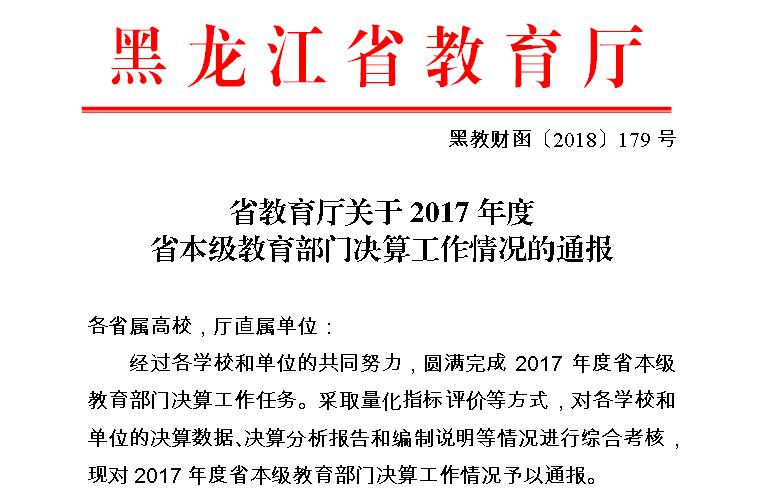近日,黑龙江省教育厅发布文件,对全省高校2017年决算工作情况进行了通报,并对先进单位和个人进行表扬。开云(中国)获得“2017年度决算工作先进单位”称号,同时获得“决算报表先进单位”、“决算分析报告和编制说明先进单位”、“资产报表填报先进单位”三个单项奖,赵方亮同志荣获先进个人荣誉称号。