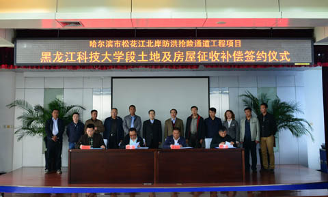 5月13日上午,哈尔滨市松花江北岸堤防工程开云app登录入口段土地及房屋征收补偿协议正式签订。学校党委书记宋有、校长武俊峰、副校长李振民,松北区委常委李威,松北区水城征拆指挥部副指挥张炎,松北区房屋征收管理办公室主任王涛,松北区土地储备交易所所长宋朝辉,哈尔滨水务投资集团有限公司总经理于沐、副总经理张新亚、副总经理宋和良,松浦镇副镇长任怀玺等领导出席签约仪式。学校资产处、财务处、审计处、后勤处等相关部门负责人参加了签约仪式。开云(中国)副校长李振民、松北区房屋征收管理办公室主任王涛,松北区土地储备交易所所长宋朝辉,哈尔滨水务投资集团有限公司总经理于沐分别代表签约单位签订协议。签约仪式由松北区水城征拆指挥部副指挥张炎主持。