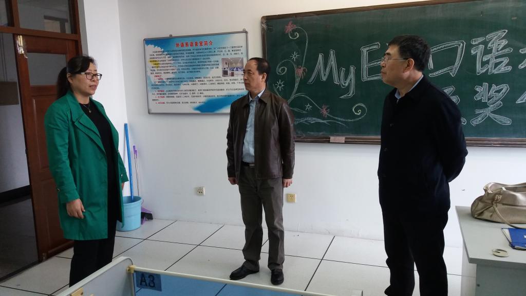 武俊峰校长一行在教学主楼还现场考察了外国语学院的语音室,详细了解语音室的桌椅、设备设施的使用情况,现场确定了专用语音室的改造意见,并要求有关部门进一步抓好落实,加快工作进度,为师生提供现代化的语言学习环境。