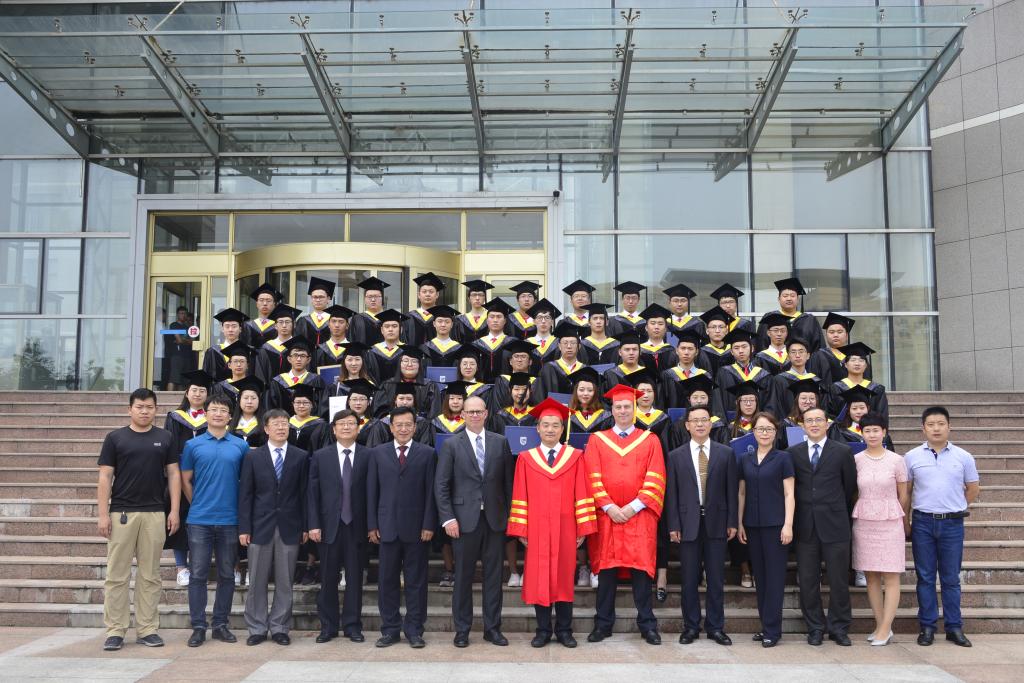 毕业典礼在校歌《江畔朝阳》的雄壮歌声中胜利闭幕,最后,中加双方校领导和参会嘉宾与毕业生亲切合影留念。