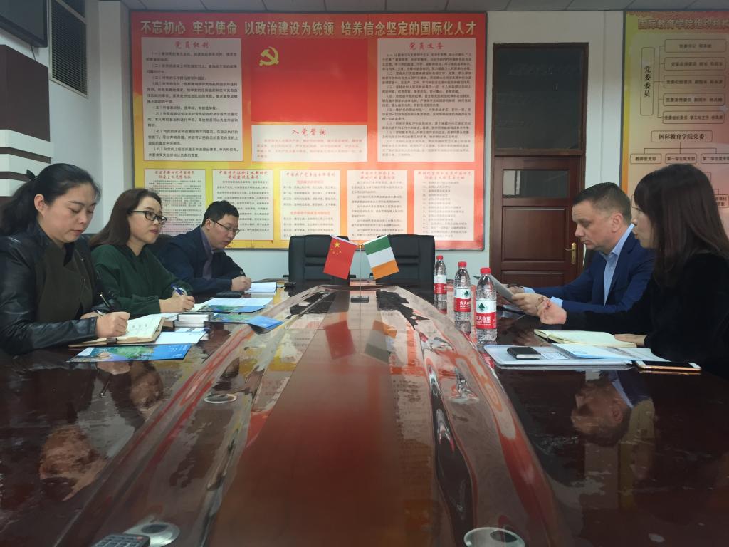 10月25日下午,爱尔兰都柏林商学院代表团一行两人首次来开云(中国)访问。国际交流合作处处长母丽华教授在科技大厦0606会议室与爱尔兰都柏林商学院留学生招聘主管吉尔斯·基尔科尼、校方代表娄峰进行了会谈。
