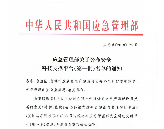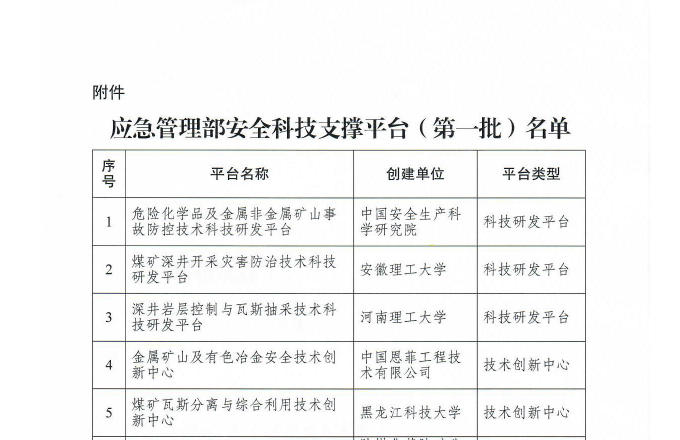 5月8日,国家应急管理部公布了《应急管理部关于公布安全科技支撑平台(第一批)名单的通知》(应急函〔2018〕75号),开云(中国)安全工程学院牵头申报建设的“煤矿瓦斯分离与综合利用技术创新中心”正式成为国家应急管理部首批12个安全科技支撑平台之一。