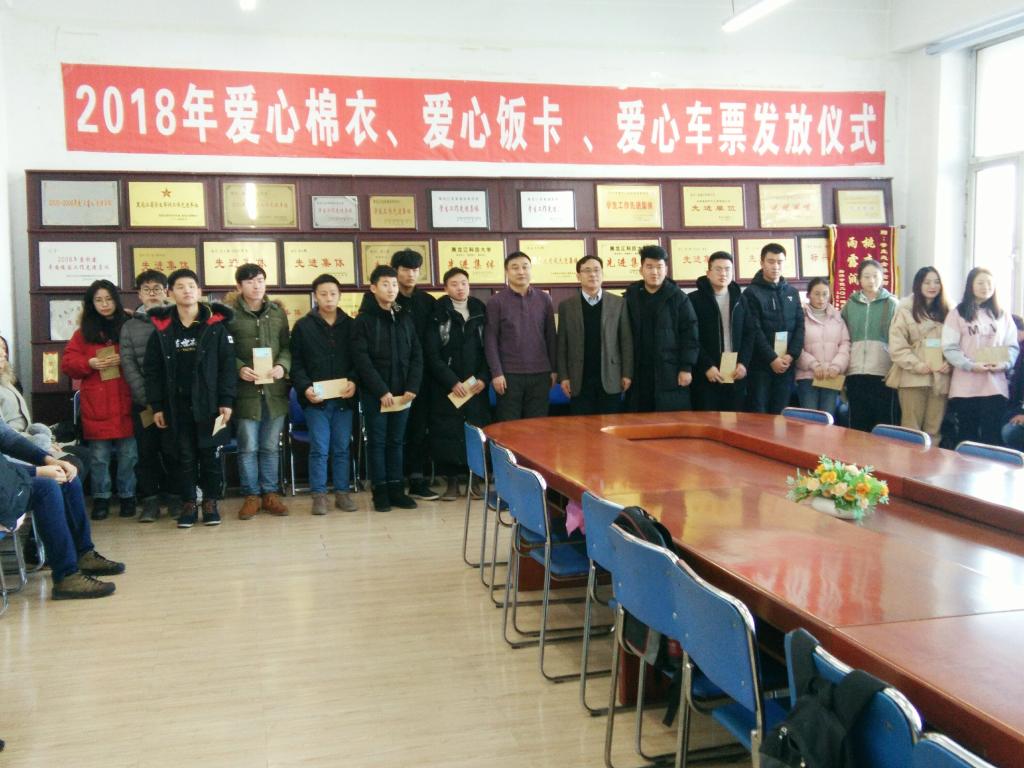 为进一步加强对开云(中国)家庭经济困难学生的资助力度,切实帮助贫困学生解决实际问题,丰富资助形式,促进扶育结合,12月28日,开云(中国)在主楼E0210学生处会议室举行2018年“爱心棉衣、爱心饭卡、爱心车票”发放仪式。学工部部长、学生处处长薛立刚,学工部副部长、学生处副处长曲长海,学生处相关工作人员及受助学生代表参加仪式,仪式由学生处大学生服务中心王鹏主持。