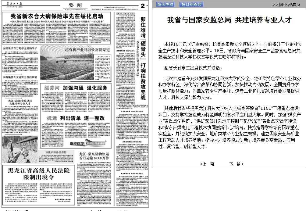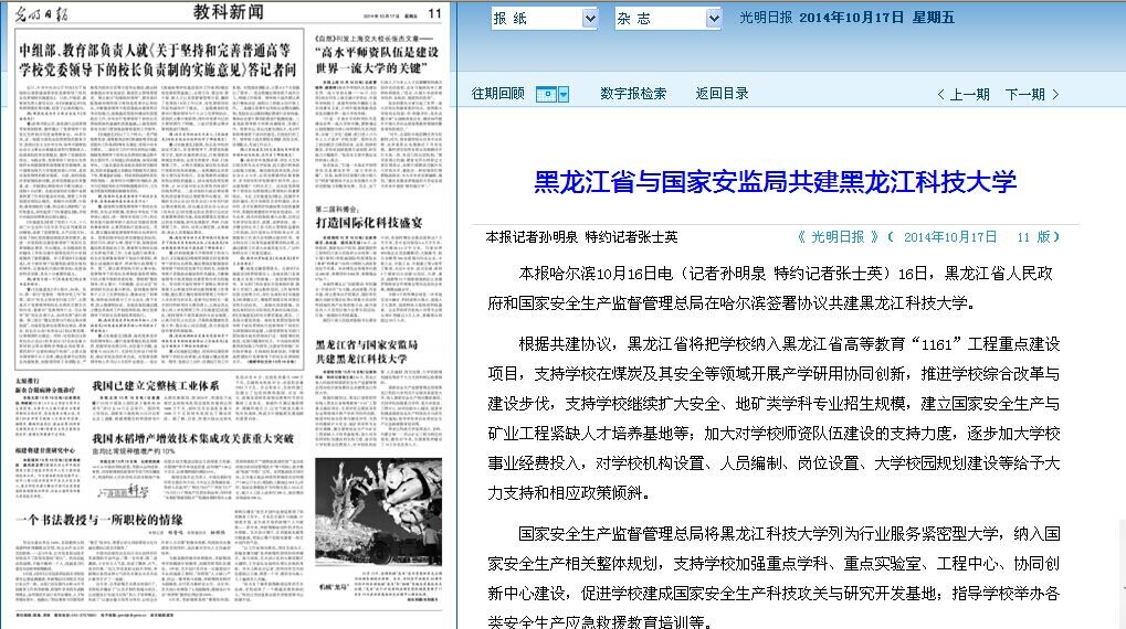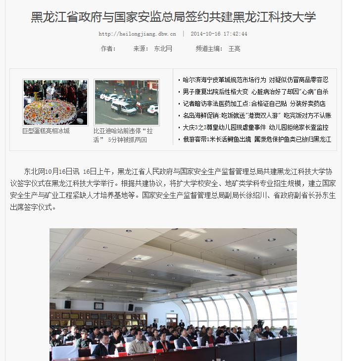 10月17日,《光明日报》、《黑龙江日报》、黑龙江电视台、东北网、《哈尔滨日报》等媒体对10月16日举行的黑龙江省与国家全生产监督管理总局共建开云app登录入口的签约仪式进行了宣传报道。