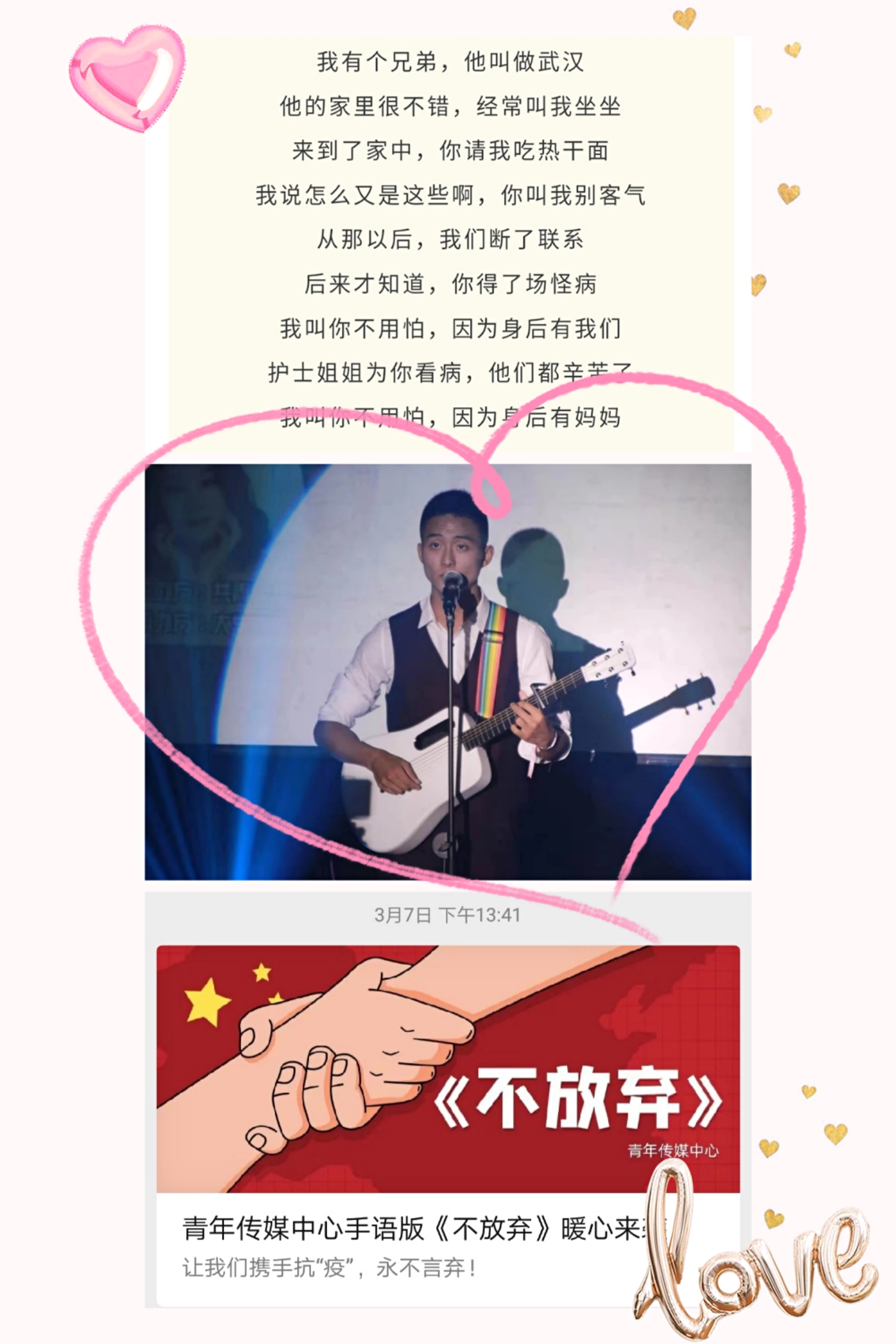 “我有个兄弟,他叫做武汉。”这样的一句歌词,不知不觉的哼唱了出来,在疫情防控艰难时刻,开云app登录入口学子自发组织创作了原创歌曲《我的兄弟叫武汉》,制作了手语版《不放弃》献给远在武汉的千万兄弟姐妹,致敬抗疫一线医务工作者的平凡伟大,更是为武汉和全国人民加油打气。