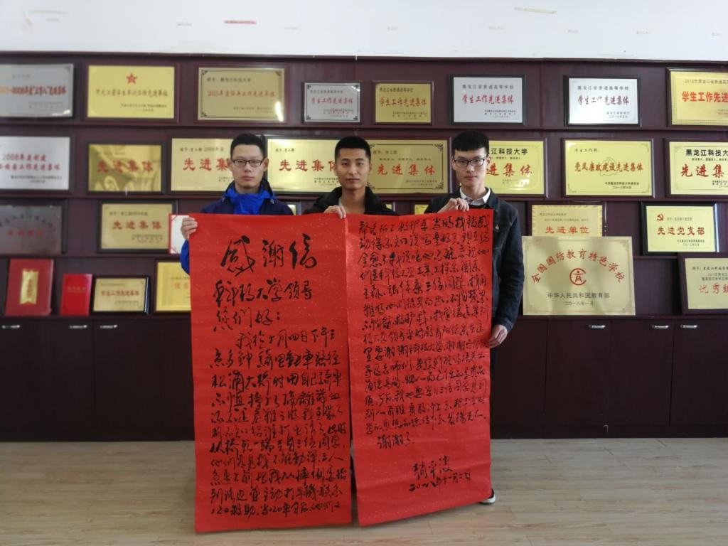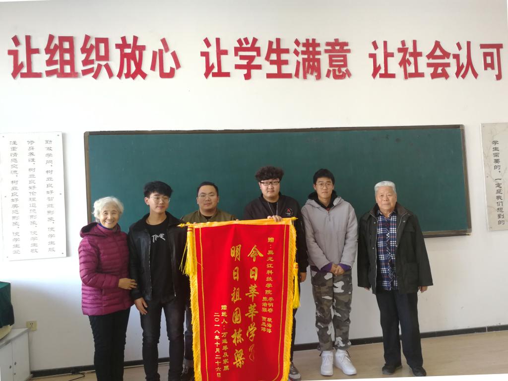 9月28日,在哈尔滨大剧院认知实习回程中的李明睿、裴海博、张浩强、贾昱博等四名学生,路遇一位老人跌倒在江堤边,四人没有犹豫立即上前相助,及时联系家属和救护人员,并不断安抚受伤老人,等到家属赶到后默默离开。11月6日,受伤老人的病情稳定后,老人的家属通过学生沟通过程中使用的手机号码找到学校,并送来锦旗表达感激之情。