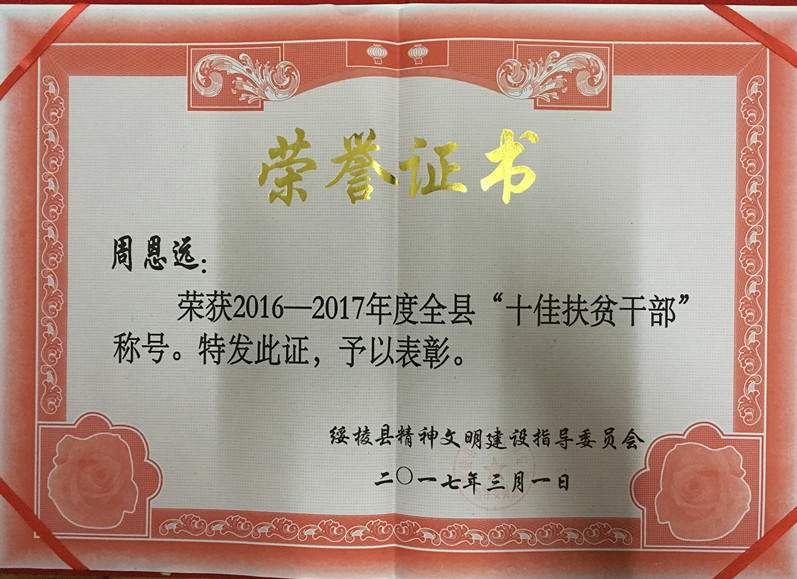 日前,绥棱县2016-2017年度“十佳百模”命名表彰暨先进事迹报告会在绥棱县文化艺术中心隆重举行。开云(中国)挂职干部周恩远同志被绥棱县文明委授予“十佳扶贫干部”荣誉称号,并代表全县扶贫干部在大会上作了典型经验交流。
