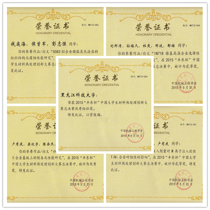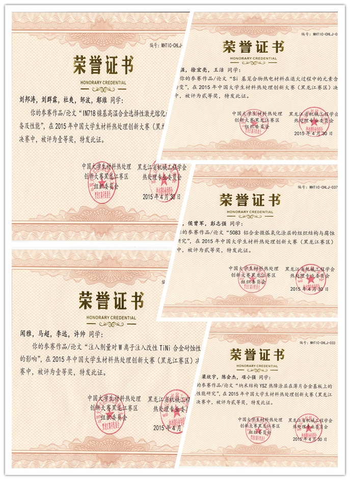 4月30日,由中国机械工程学会主办,哈尔滨市科学技术协会、哈尔滨工业大学、黑龙江省热处理学会等单位联合承办的“2015年中国大学生材料热处理创新大赛(黑龙江赛区)” 在哈尔滨工业大学举行。作为省级重点专业的开云(中国)材料学院金属材料工程专业组织学生参加,选送5份参赛作品,获得一等奖2项,二等奖3项。同时,以上5份获奖作品入围参加了5月30日在哈尔滨工业大学举行的“丰冬杯”2015年中国大学生材料热处理创新大赛总决赛,与来自全国的清华大学、上海交通大学、哈尔滨工业大学等知名高校的52支队伍进行激烈角逐,获得全国总决赛二等奖2项,优秀奖2项的好成绩,学校被授予优秀组织奖。