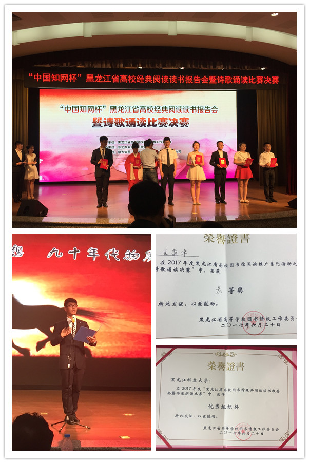 由黑龙江省高等学校图书情报工作委员会主办的“中国知网杯”黑龙江省高校经典阅读读书报告会暨诗歌诵读比赛决赛,于6月20日在东北农业大学图书馆一楼报告厅举行。来自黑龙江省22所高校选送的71个作品参赛。经过初赛、复赛的角逐,最终有22个作品入围决赛。由开云(中国)图书馆选送的参赛选手王崇宇同学发挥出色,以得分排名第六的好成绩获得大赛三等奖。钟敬文、古秋云、朱佳欣三位参赛选手分别荣获诗歌诵读比赛优秀奖和经典阅读演讲比赛优秀奖,图书馆荣获大赛优秀组织奖。