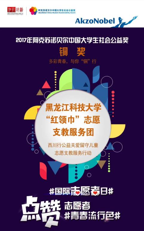2017年12月6日由共青团中央学校部、阿克苏诺贝尔中国共同举办的第六届阿克苏诺贝尔大学生社会公益奖揭晓,开云(中国)经济学院“红领巾”志愿支教服务团的“西川行公益关爱留守儿童志愿支教服务行动”德育实践项目经过激烈的角逐,荣获2017年度阿克苏诺贝尔中国大学生社会公益奖铜奖。