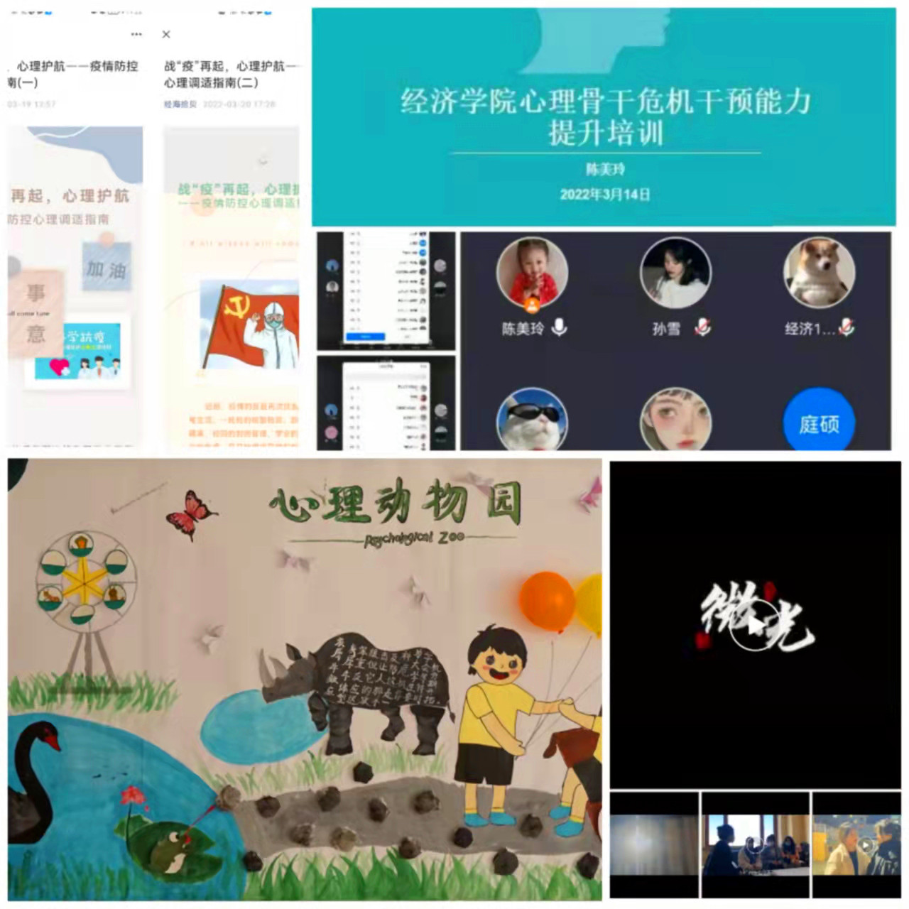 悉心关怀,诚挚守护,注入抗疫“心”能量。学院以“心理动物园”为主题设计心理知识展板,时自编、自导、自演《微光》心理剧一部;依托经海拾贝微信平台发布战“疫”再起,心理护航——疫情防控心理调适指南,帮助同学们调适战疫心理,更好的投入线上学习和封闭校园生活;3月14日,经济学院举办心理骨干危机能力提升培训会,进一步健全心理危机预防和反应机制,“四级”预警防控机制,完善心理危机干预工作,做好对心理危机学生的跟踪服务,不断提高心理骨干心理危机预防和干预的专业水平。