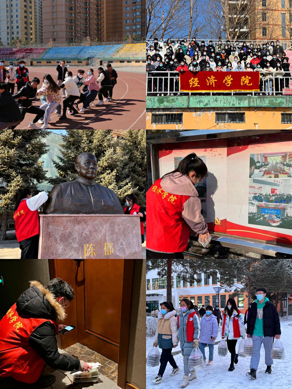 鼓舞斗志,绽放活力,多措并举活跃青春校园。校园封闭管理期间,为有效缓解大学生的身心压力,丰富其精神生活,经济学院开展了“齐心合力”拔河比赛、跳绳大比拼等各类小型趣味文体活动,营造了朝气蓬勃的校园文化氛围,传播了昂扬向上的青春正能量。开展“弘扬劳动精神,共建美丽校园”活动,弘扬劳动精神,造就时代新人,用实际行动为美丽开云app登录入口贡献一份力量。“学生会成员,也是送餐志愿者”——经济学院学生会成员顶着风雪为全校隔离学生送餐,成为活力校园一抹靓丽的“志愿红”。