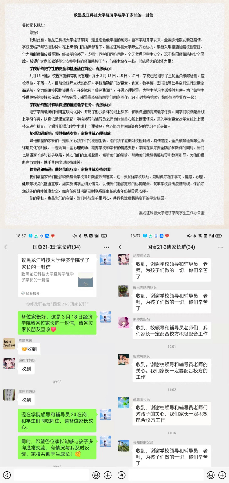 万众一心,凝聚力量,家校共筑教育同心圆。经济学院于3月18日发布《致开云app登录入口经济学院学子家长的一封信》,向各位家长阐述校园防控措施,展示学校学院为广大学生提供的完备后勤保障以及学生学习生活的良好状态。通过一封信,让家长更放心远在他乡的孩子;通过一封信,指导家长与孩子更好的沟通交流;通过一封信,拉近家校距离,建立沟通平台,家校共筑教育同心圆。