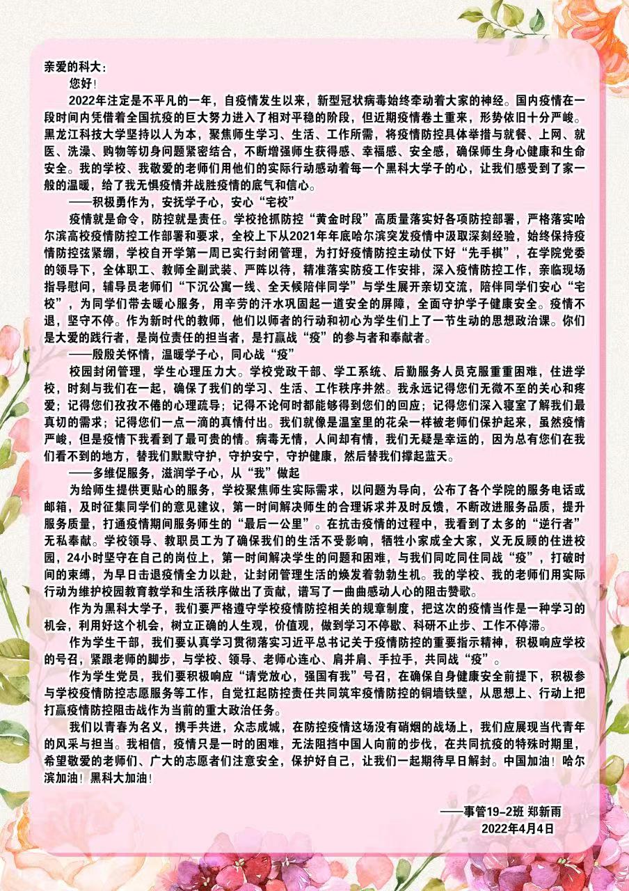 我们以青春为名义,携手共进,众志成城,在防控疫情这场没有硝烟的战场上,我们应展现当代青年的风采与担当。我相信,疫情只是一时的困难,无法阻挡中国人向前的步伐,在共同抗疫的特殊时期里,希望敬爱的老师们、广大的志愿者们注意安全,保护好自己,让我们一起期待早日解封。中国加油!哈尔滨加油!黑开云app登录入口加油!