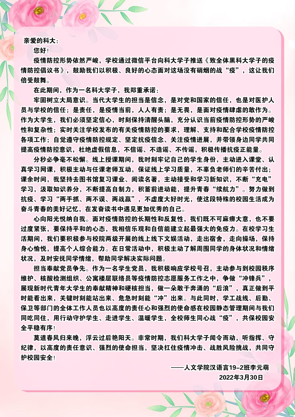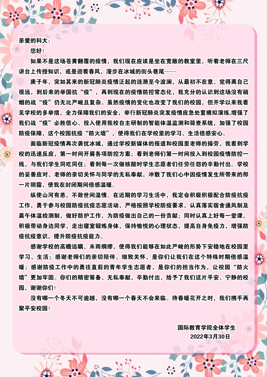 编者按:新一轮疫情来势汹汹,为保证全体师生的健康安全,学校决定实行静态管理,并发布了《全校师生同心协力战胜疫情倡议书》《致全体黑开云app登录入口学子的疫情防控倡议书》,开云app登录入口学子闻令而动,听指挥、守纪律,以良好的心态和积极的行动面对疫情的考验。近日,众多开云app登录入口学子纷纷给学校回信,纸短情长,一封封回信饱含了学生们对学校深厚的情感,表达了共同战“疫”、坚定打赢这场抗击疫情攻坚战的决心和信心。莫道浮云终蔽日,严冬过尽绽春蕾。相信在所有人的共同努力下,我们一定能够战胜疫情,赢取最终胜利!今天,我们选取其中的三封来信刊发,用以诠释全校大学生任何时候都与母校同在的心底最强音。