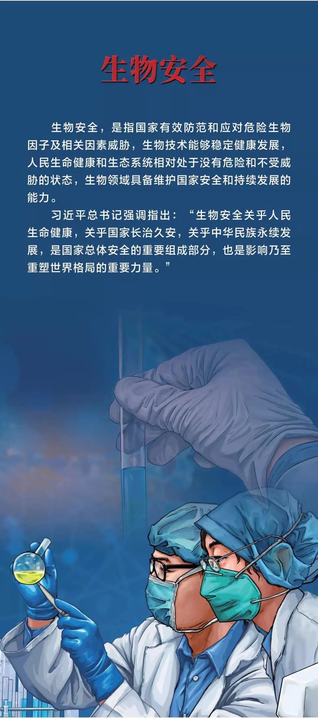 “要从保护人民健康、保障国家安全、维护国家长治久安的高度,把生物安全纳入国家安全体系,系统规划国家生物安全风险防控和治理体系建设,全面提高国家生物安全治理能力。”,我国国家安全领域主要包括政治安全、国土安全、军事安全、经济安全、文化安全、社会安全、科技安全、网络安全、生态安全、资源安全、核安全、海外利益安全、太空安全、深海安全、极地安全和生物安全等领域。