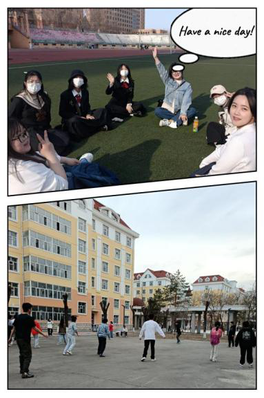 15:00,阳光正好铺满了操场,场上也十分热闹,有人在踢足球,比赛正如火如荼的进行着,不时传出或高兴或遗憾的喊声;有人在跑步,或是三三两两结伴而行,或是自己一个人在跑道上挥洒汗水;也有人和我们一样,和好友们围坐在一起,不同的是他们在丢手绢,而我们开始了狼人杀。美中不足的是我们坐的位置有点惊险,总担心要被足球“光顾”。玩了几局后,有学妹就提议去丢沙包,恰好袁梦茜书包里就有一个,真是天时地利人和。
