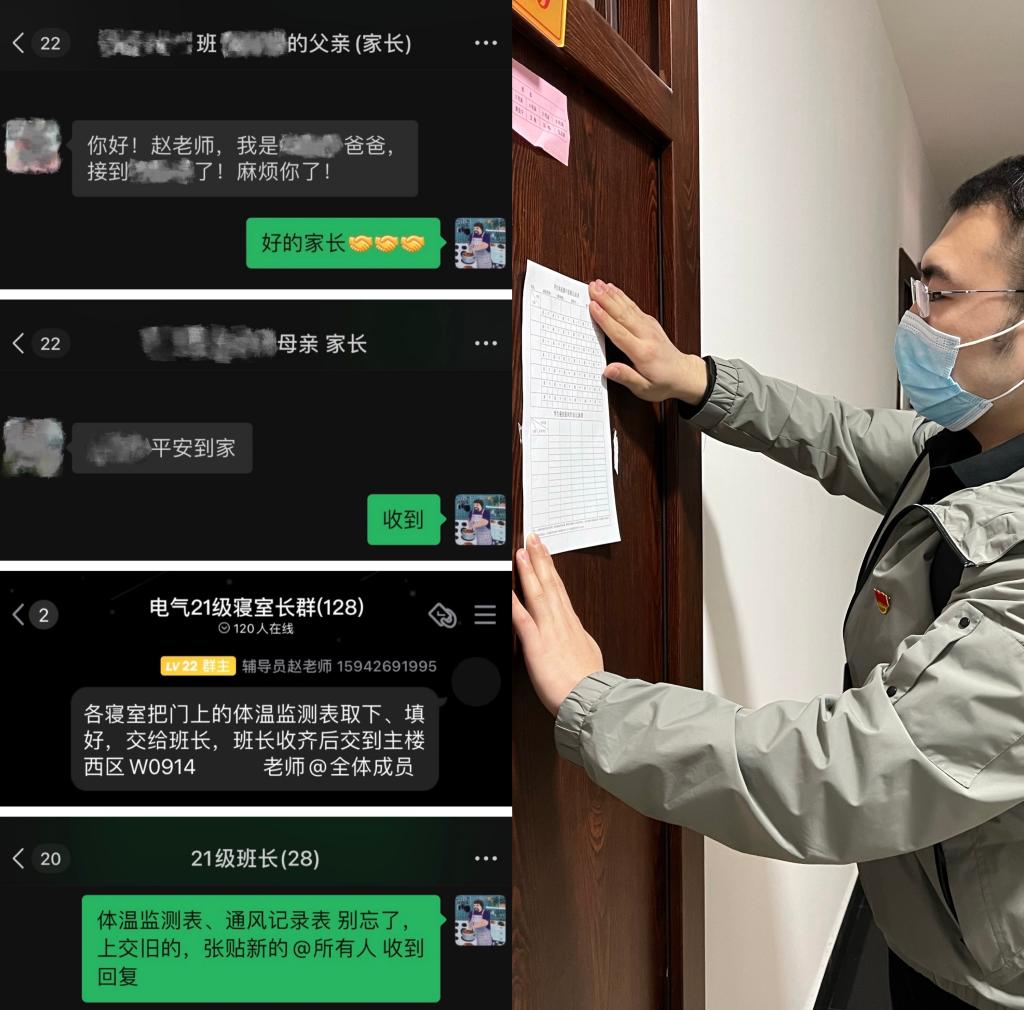 15:25联系2名请假回家学生的家长确认其到家情况。在收到家长的“孩子已平安到家”的回复后,我靠在椅子上感觉有点头晕,在值班学生的提示下才发现自己没吃午饭,简单吃了几片饼干后,通知各公寓楼层负责人收齐第七周体温监测通风记录表,并下发第八周体温监测通风记录表。为了避免个别寝室出现拖延执行的情况,我每次走访寝室都会备着一些监测表,遇到个别没及时张贴监测表的寝室,我都会帮着贴一贴。