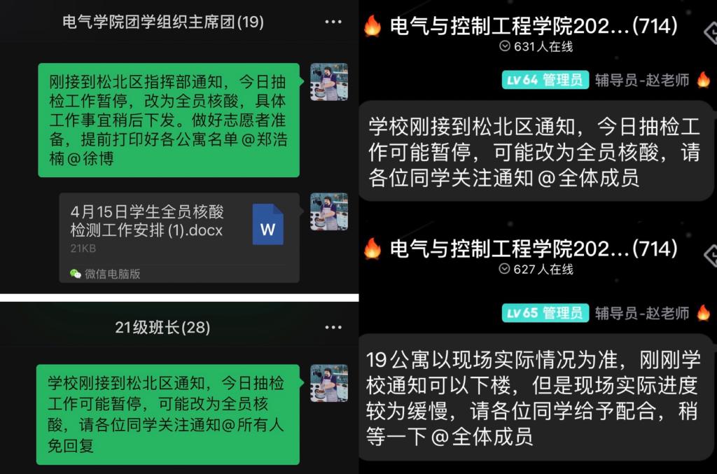7:03接到学生处通知,今日核酸抽检改为全员核酸检测。看到通知后我第一时间联系学生组织和班级干部,调整核酸检测工作安排。身经百战的志愿者们早已习惯了这种临时的工作安排,能够迅速的做出调整。