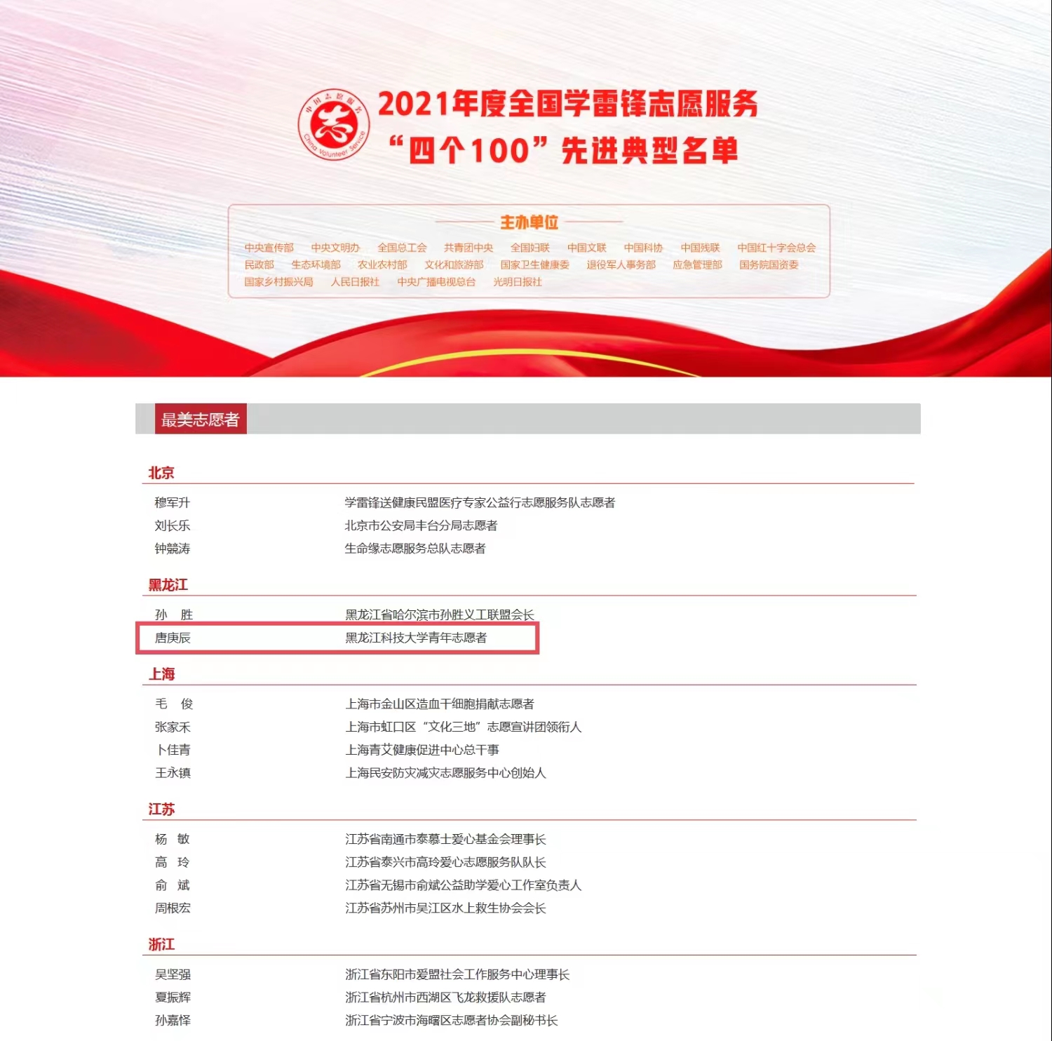 近日,中央宣传部、中央文明办、全国总工会、共青团中央等部门和单位共同组织开展的2021年度全国学雷锋志愿服务“四个100”先进典型宣传推选活动中,开云(中国)唐庚辰同学被授予“最美志愿者”荣誉称号。唐庚辰同学是本次被表彰的全国100名“最美志愿者”中唯一一名高校本科生,是迄今为止开云(中国)青年志愿者所获得的最高荣誉。