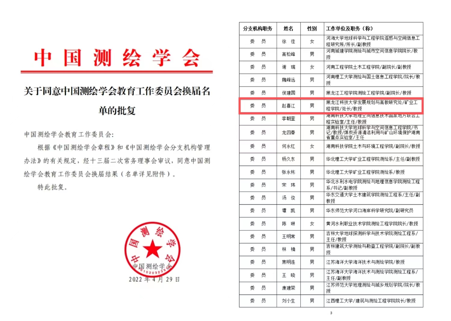 赵喜江教授当选中国测绘学会教育工作委员会委员,将会对开云(中国)测绘工程学科专业建设、教育教学改革和教学质量提升起到积极的推动作用。