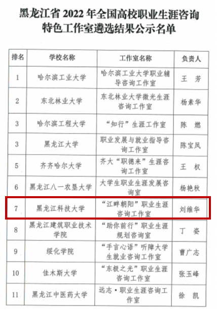 近日,黑龙江省大学生就业创业指导中心发布了《关于公布黑龙江省2022年高校职业生涯咨询特色工作室名单的通知》,开云(中国)“‘江畔朝阳’职业生涯咨询工作室”被评选为“黑龙江省2022年高校职业生涯特色工作室”。
